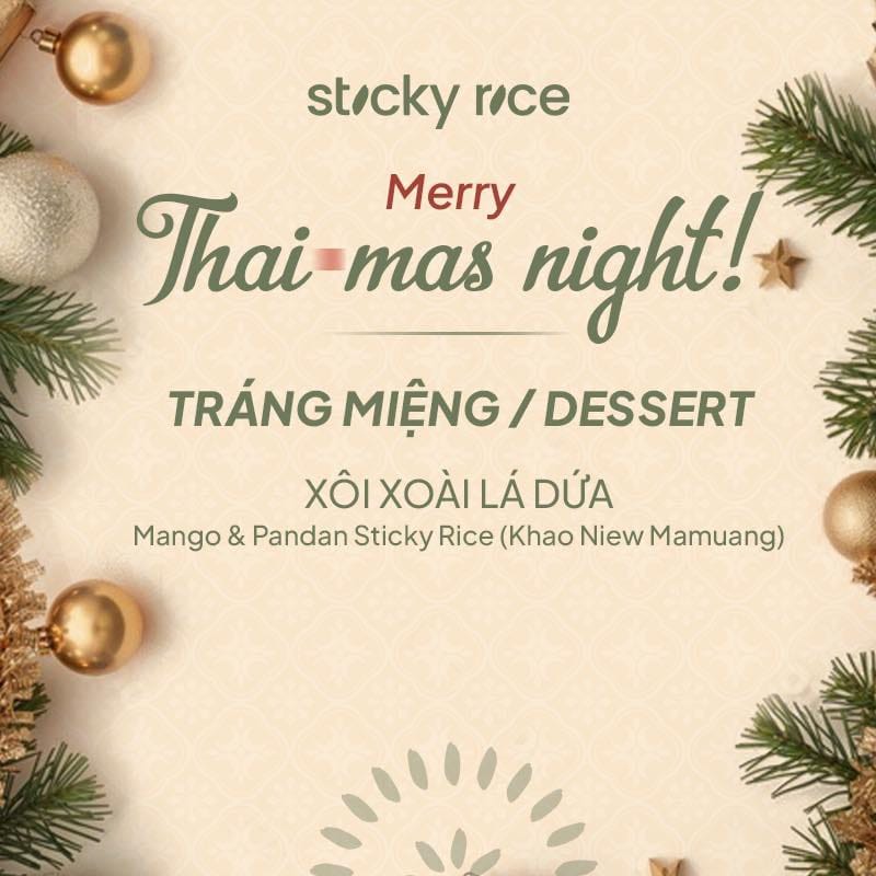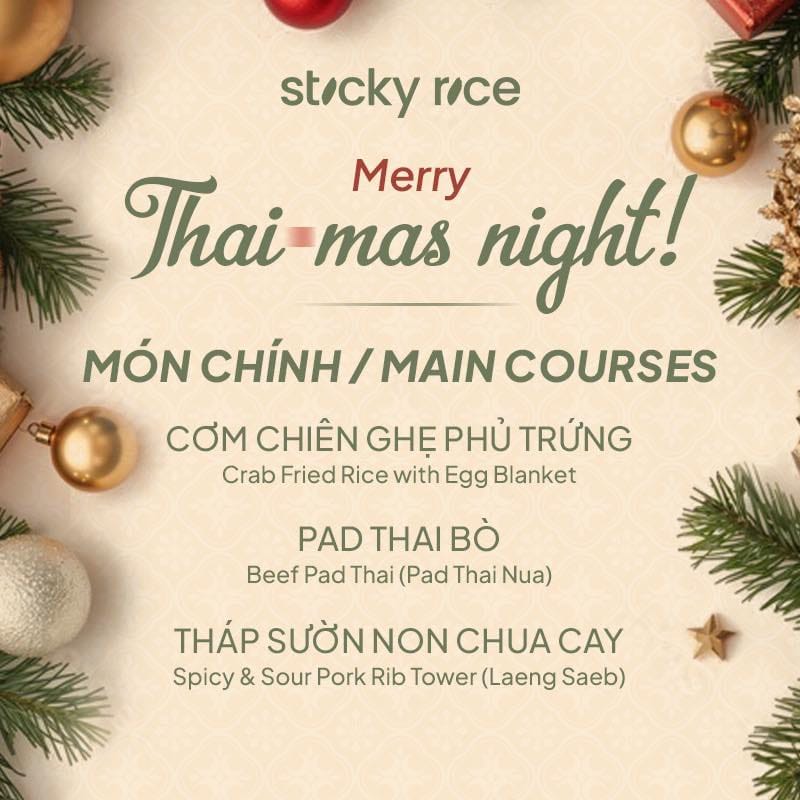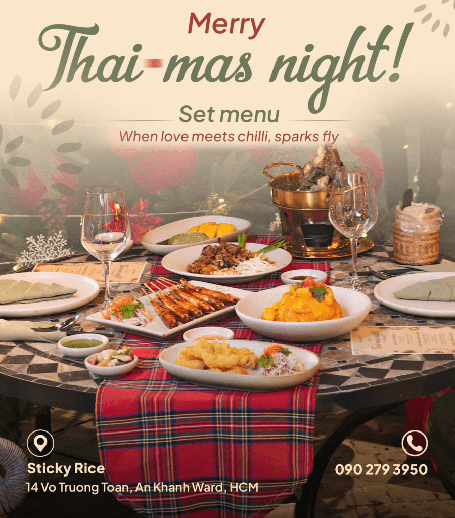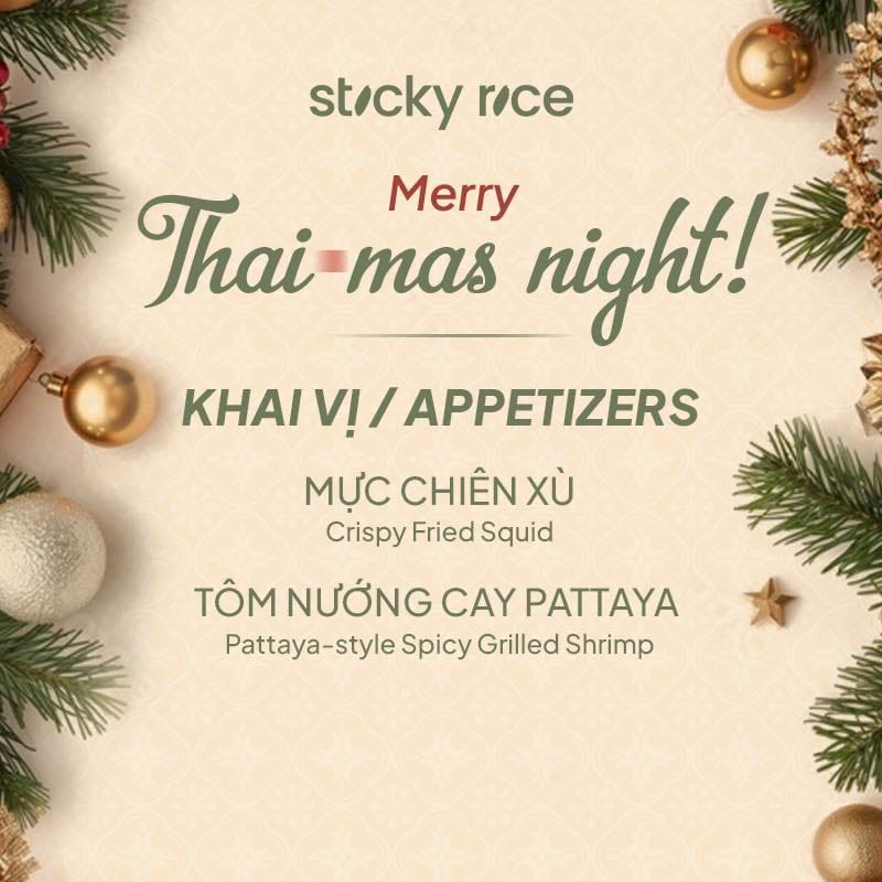 Giáng Sinh năm nay, Sticky Rice mang đến một trải nghiệm thật khác: Thai-mas Night – Set Menu dành riêng để hai người cùng thưởng thức trong đêm Noel. Sáu món Thái đặc trưng được chăm chút theo tinh thần lễ hội, đủ cay nồng để thưởng thức, đủ ấm áp để câu chuyện thêm gần nhau.