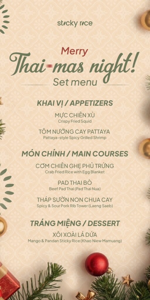 Bàn tiệc Giáng Sinh tại Sticky Rice – 14 Võ Trường Toản đã sẵn sàng để bạn tận hưởng một đêm thật ấm áp và tròn vị.